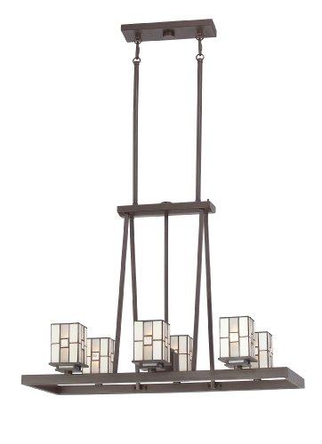 #A modern take on Arts & Crafts design, the Finley large chandelier is a spectacle with Western Bronze finish. The engineered metal frame hangs securely from a rectangular top canopy, with rods connecting to a lower canopy, and then to the large base holding the lights. Six upright, rectangular Tiffany style shades are each made up of 36 separate pieces of frosted white and off-white art glass. An additional accent light sits in the center of the base.