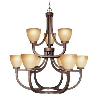 #12147-BRZ Features: -Chandelier. -Wayman collection. -Number of light: 9. -Finish: Bronze. -Burnt etched glass. -UL listed for dry locations. Specifications: -Bulb type: 100W medium base bulbs. -Overall dimensions: 36.125" H x 35.25" W.