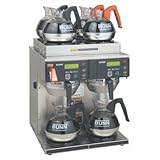 | ✚✚✚ Axiom 4/2 Automatic Twin Coffee Brewer (Four Top Warmers, Two Lower Warmers) 38700.0014 Features: -Twin brew head system..-Brews 15 gallons (56.8 litres) of perfect coffee per hour..-Six individually controlled warming stations..-For high lime areas, BrewLOGIC technology calculates flow rate and adjusts brew time to maintain consistent pot levels..-BrewWIZARD technology incorporates simplified programming with a LCD display..-Ensures coffee brew quality with cold brew lock out capability..-SplashGard funnel deflects hot liquids away from the hand..-Digital temperature control and accuracy..-Pot level, cold brew lock-out and tank temperature set easily from advanced touch pad on front of machine..-Electronic diagnostics and built in tank drain make service easier..-Coffee extraction controlled with programmable pre-infusion or pulse brew..-Energy-saver mode reduces tank temperature during idle periods..-Decanters sold separately.-Plumbing: 20-90 psi (138-621 kPa). Machines supplied with 1⁄4'' male flare fitting.-Brewing Capacity: 15 gal/hr.. Includes: -Includes hot water faucet.. Construction: -All stainless steel construction.. Specifications: -Electrical: 3-wires plus ground, single phase, 60 Hz.. Dimensions: -Overall Dimensions: 19.1 H x 16.4 W x 17.7 D.